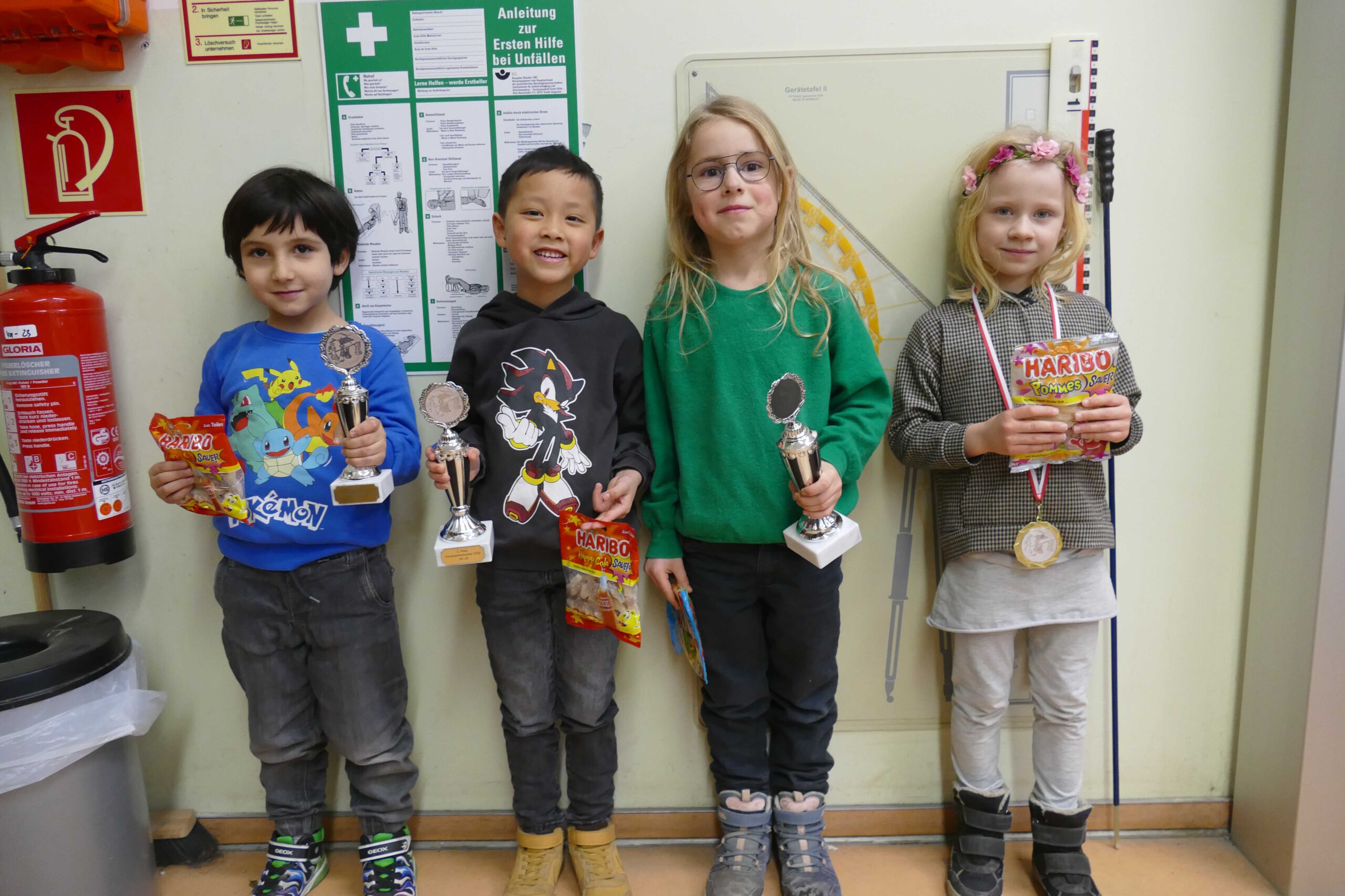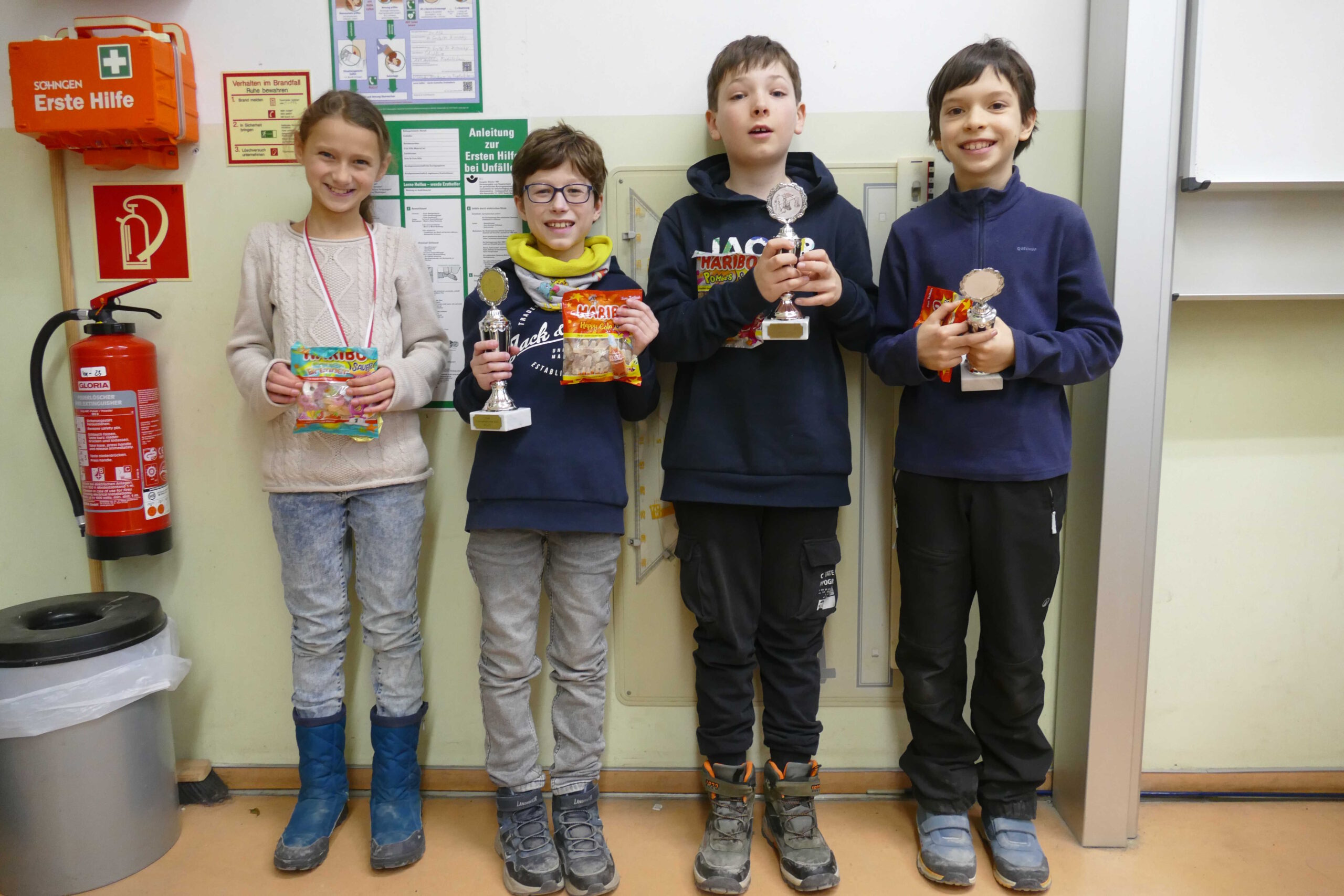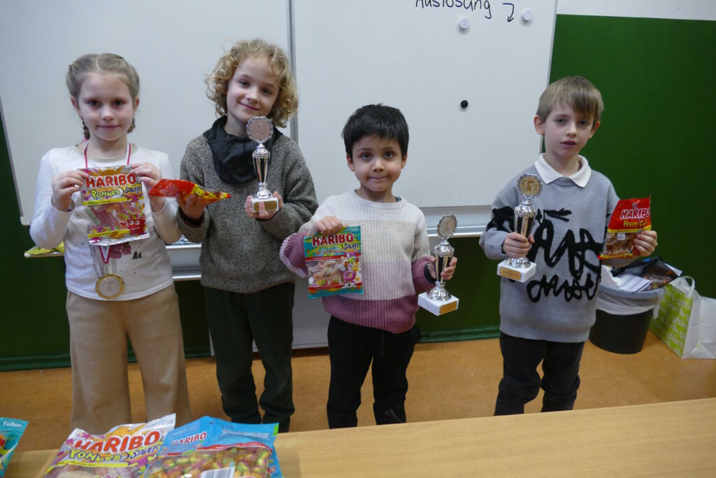 Die erste Mannschaft spielte in der Aufstellung Felix, Leon, Arame und Noah. In der erste Runde gewannen wir gegen TSG 2, mussten dann aber in der 2. Runde gleich gegen Makkabi ran. Die waren zwar Favorit, doch wär mehr als das 1:3 durchaus drin gewesen (Leon konnte gewinnen). Runde 3 brachte dann die eigene zweite und erneut ein 3:1. Sonntag ging es morgens gleich gegen den nächsten Favoriten: Gegen Empor verloren wir wie gegen Makkabi 1:3, der Punkt kam von Noah. Und so kam es, dass wir in der letzten Runde spielfrei hatten… Am Ende reichte es nach Zweitwertung eindeutig für Platz 3 aus. Platz 1 und 2 teilen sich verdient Makkabi und Empor ganz knapp nach Zweitwertung. Wir haben zwar genauso viele Mannschaftspunkte wie Caissa, doch die deutlich bessere Zweitwertung (und überhaupt die beste Buchholz). Da wir ein Jahr jünger als alle anderen Mannschaften waren, geht dieser 3. Platz absolut in Ordnung. Zum nächsten Jahr wachsen quasi alle anderen raus, sodass es dann besser aussehen sollte.